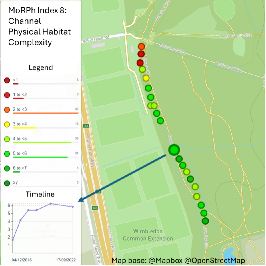 Introduction: The Crane Valley Partnership has always had a very active community of volunteers. Over the last four years, as part of the Thames Water funded Smarter Water Catchment programme, MoRPh has been widely adopted across the Crane catchment to increase knowledge of the physical habitat characteristics of the river; to link macroninvertebrates to physical habitat at Riverfly monitoring sites; and to track the impacts of river restoration measures. The last two items have been conducted in collaboration with the Zoological Society of London.