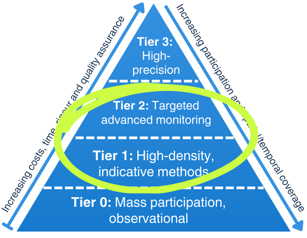 Ensuring volunteers understand the applications of this type of monitoring and when it might be appropriate to transition to Tier 2 methods ensures the programme remains both accessible and scientifically robust. This demonstrates the need for establishing collaborative monitoring schemes that provide opportunities for upskilling to promote volunteer retention.